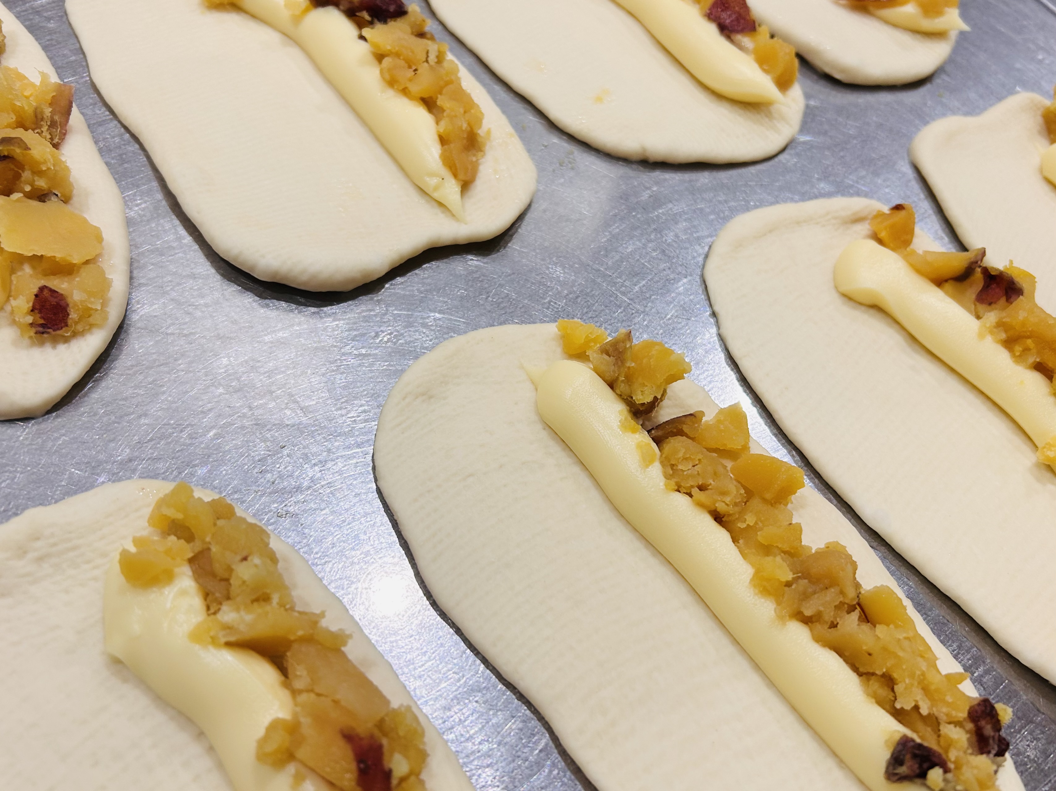 原材料名:小麦粉(国内製造)(北海道産)、クリーム(植物油脂、水あめ、砂糖、脱脂粉乳、乳蛋白、全卵、小麦粉、洋酒、食塩)、さつまいも(さつまいも、砂糖、還元水あめ、食塩、アセロラ果汁)、卵、生乳、ごま、甜菜糖、食塩、蜂蜜、パン酵母/乳化剤、V.C
